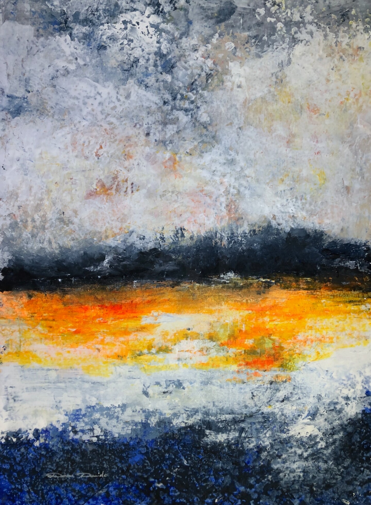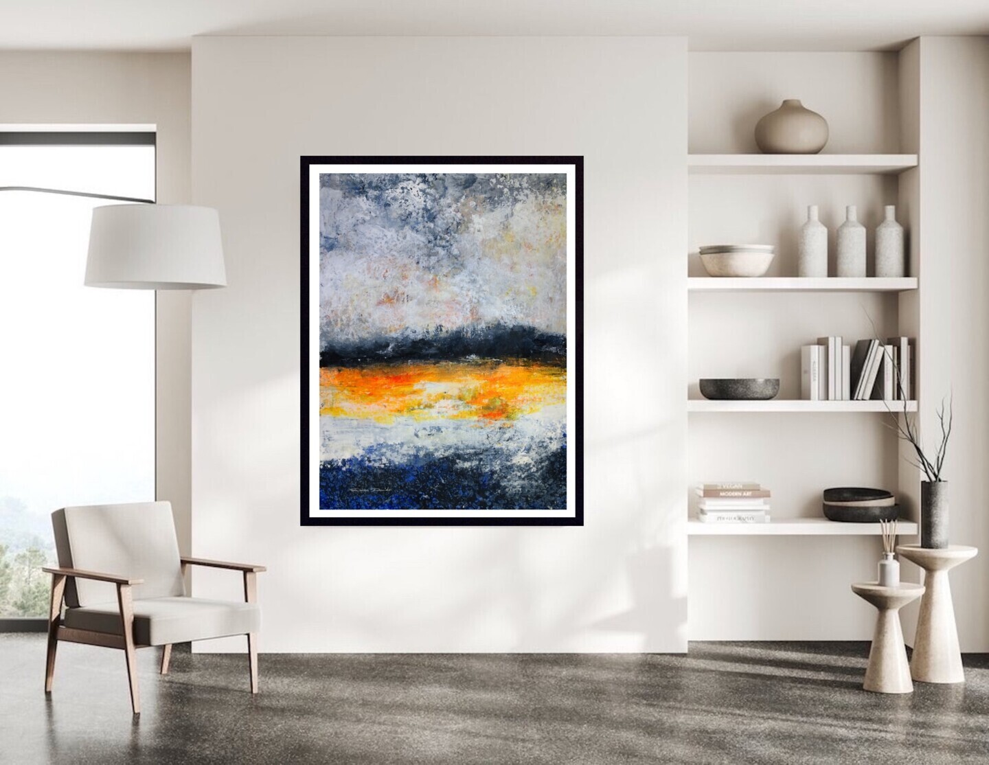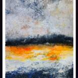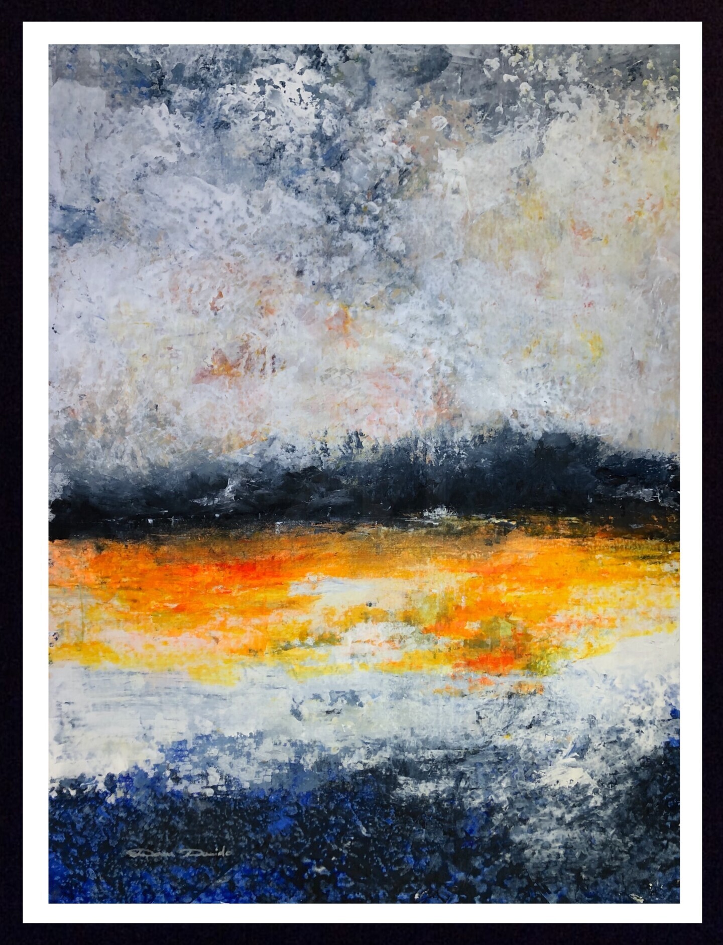 Cette œuvre abstraite évoque une scène crépusculaire saisissante. La toile est dominée par un ciel tumultueux, composé de teintes grises et blanches tourbillonnantes, illustrant une atmosphère chargée. Séparant le ciel du premier plan, une bande incandescente d'orange et de jaune illumine la composition, semblant capturer un horizon enflammé. En bas, des nuances de bleu profond et de blanc se mêlent, représentant une mer agitée. La texture riche et granuleuse apporte une dimension tactile à l'œuvre, suggérant la puissance et la turbulence de la nature. Chaque coup de pinceau contribue à l'intensité émotionnelle, tandis que les contrastes de couleurs soulignent la transition dramatique entre calme et chaos. Cette peinture capture avec audace un moment éphémère où lumière et obscurité se rencontrent, invitant le spectateur à contempler sa propre interprétation du paysage.