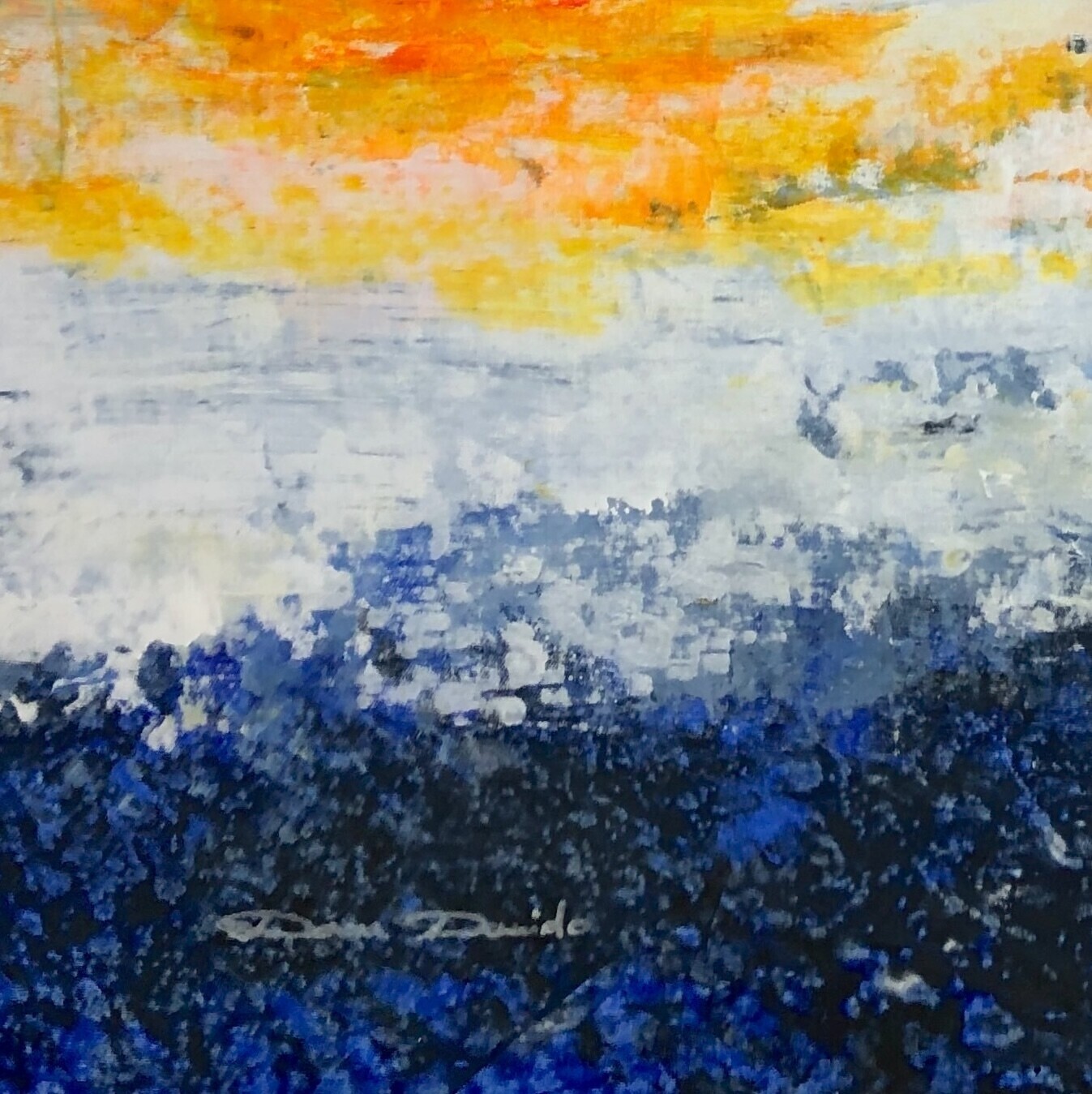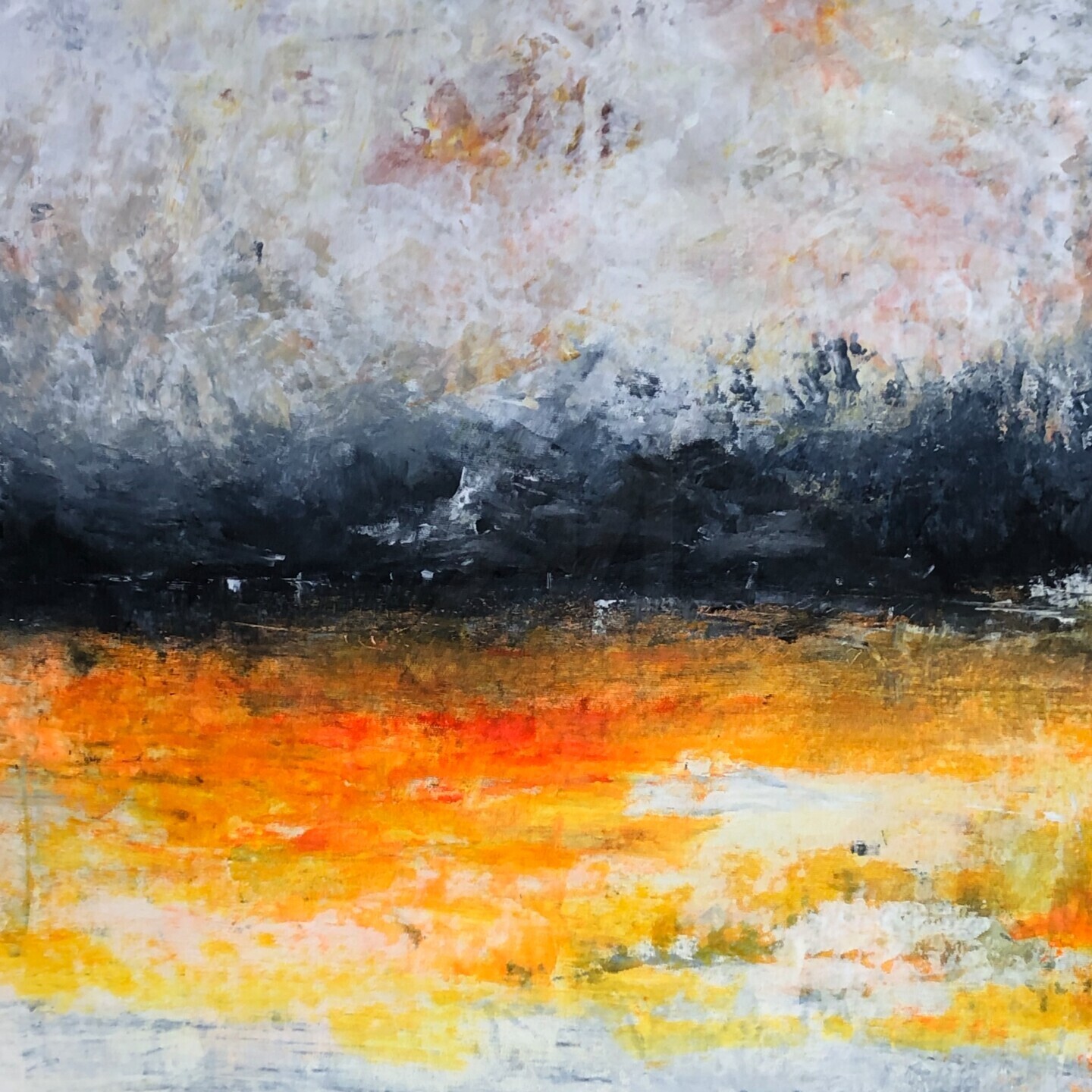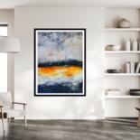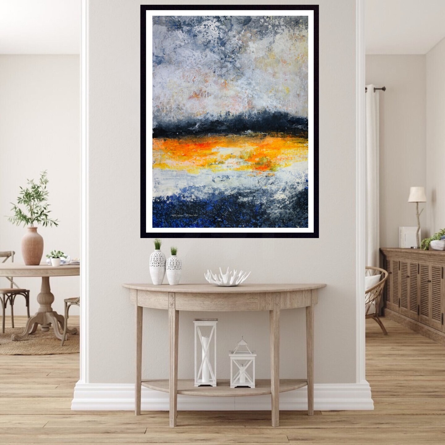 Cette œuvre abstraite évoque une scène crépusculaire saisissante. La toile est dominée par un ciel tumultueux, composé de teintes grises et blanches tourbillonnantes, illustrant une atmosphère chargée. Séparant le ciel du premier plan, une bande incandescente d'orange et de jaune illumine la composition, semblant capturer un horizon enflammé. En bas, des nuances de bleu profond et de blanc se mêlent, représentant une mer agitée. La texture riche et granuleuse apporte une dimension tactile à l'œuvre, suggérant la puissance et la turbulence de la nature. Chaque coup de pinceau contribue à l'intensité émotionnelle, tandis que les contrastes de couleurs soulignent la transition dramatique entre calme et chaos. Cette peinture capture avec audace un moment éphémère où lumière et obscurité se rencontrent, invitant le spectateur à contempler sa propre interprétation du paysage.